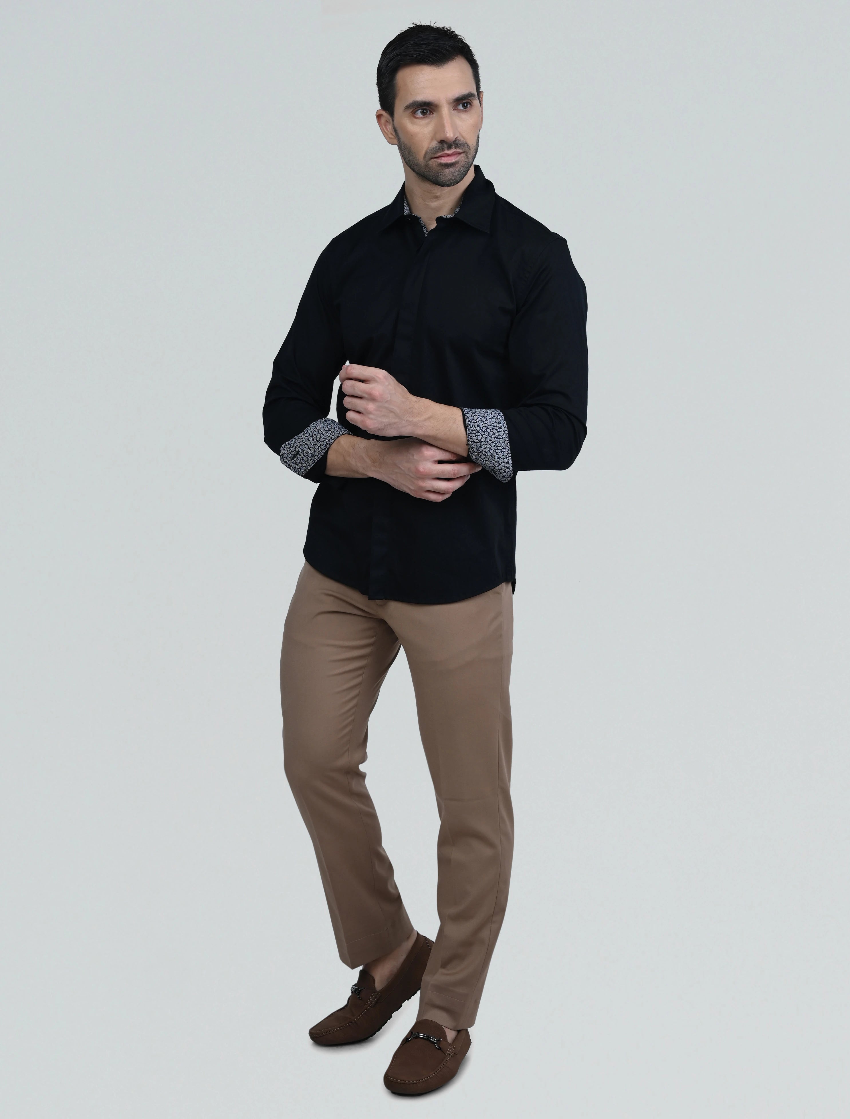Subtle contrast detailing at the collar, cuffs, and placket adds a touch of refined elegance.
